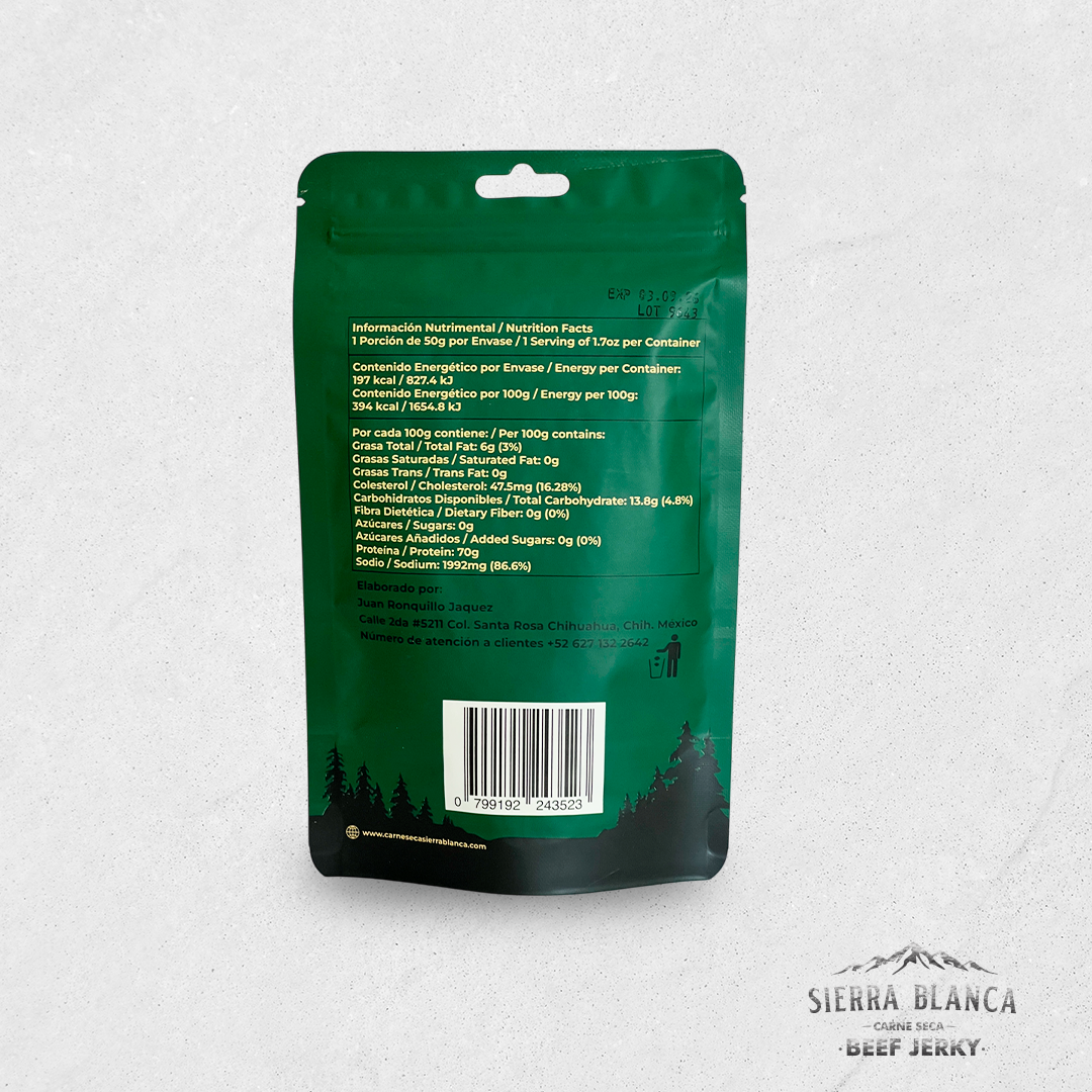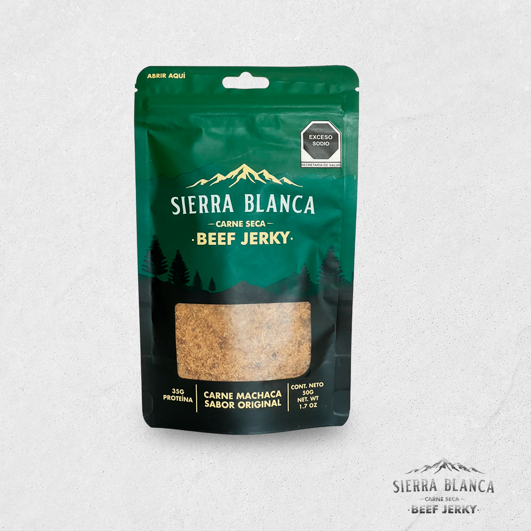 Carne Machaca Sierra Blanca sabor original en presentación de 100 g en caja. Producto elaborado en Chihuahua, México, con procesos artesanales y cortes seleccionados.